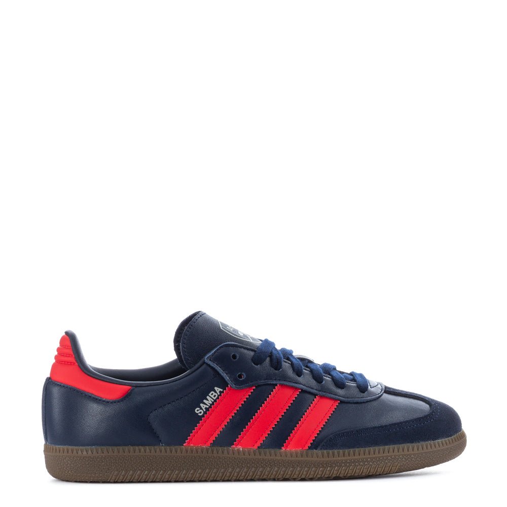 Lace up the Samba OG and kick it old-school. A perennial favorite in the adidas Originals stable of iconic shoes, this standout version uses a mix of smooth leathers accented with bold stitch detail and the always-fresh serrated 3-Stripes. The low-profile rubber cupsole gives you traction originally designed for indoor sports but now makes its plays on the street. Contrast lace overlays, tongue, and collar lining give this version of the legend its distinction.